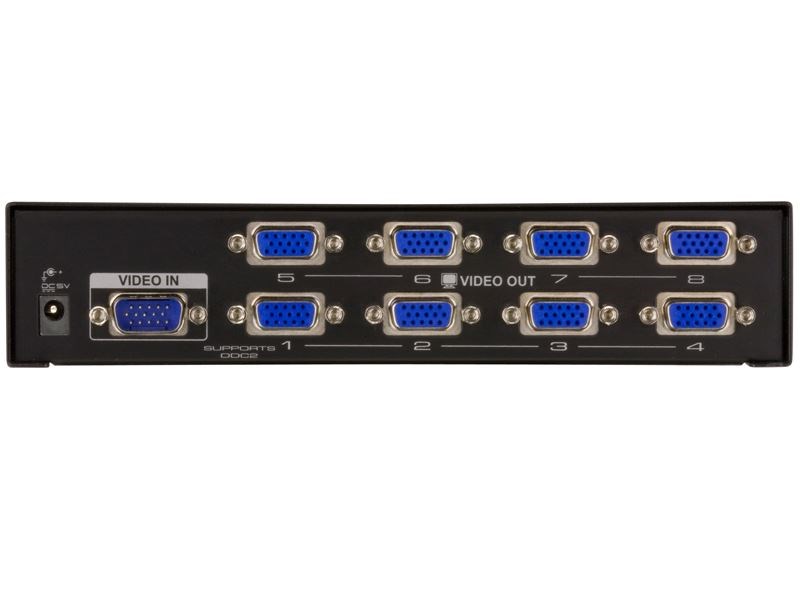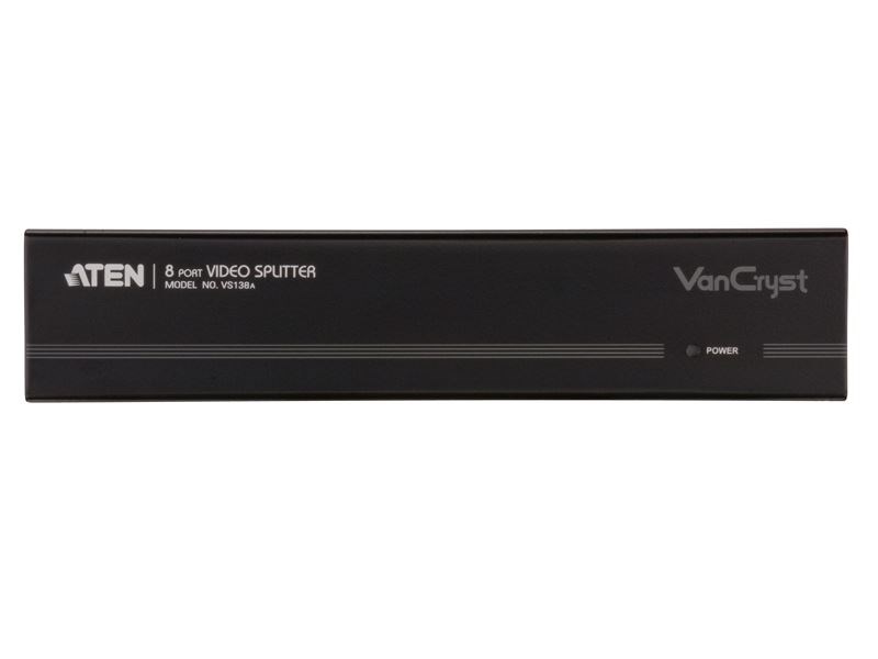The VS138A Video Splitter is a boosting device that duplicates a video signal from one source to 8 output devices. Cascadable to three levels, the VS138A provides up to 512 video signals, in addition to extending transmission distance up to 65 m, making it excellent for public broadcast systems. To transmit multiple, high-quality VGA, XGA, SVGA, UXGA, QXGA or multisync video signals over long distance without hassle, the VS138A is your best choice.