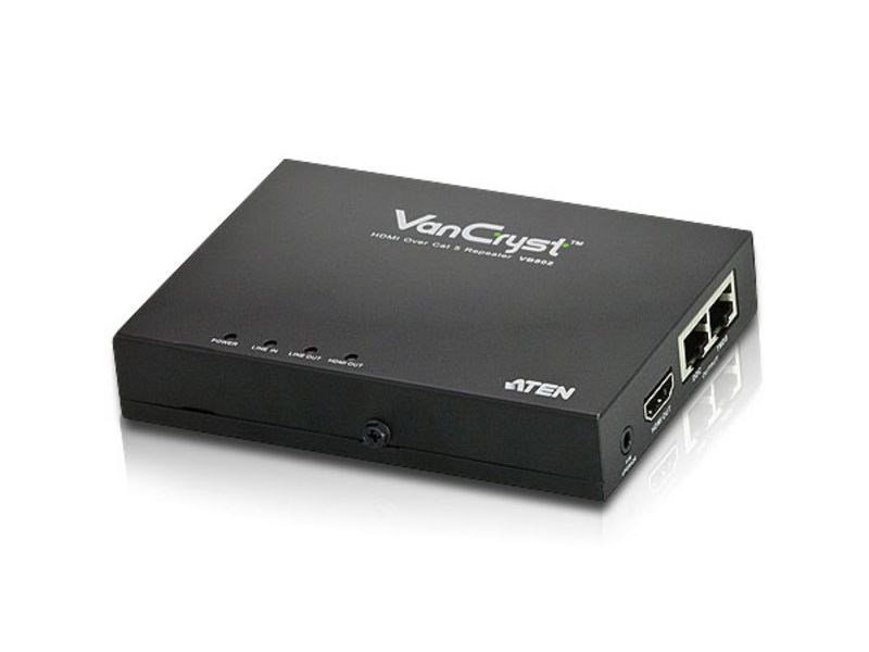 The VB802 HDMI Over Cat 5 Repeater is an HDMI signal extension device which is compatible with ATEN HDMI Over Cat 5 Splitters or Extender. The VB802 extends the transmission range an extra 60m over two Cat 5e cables.